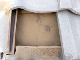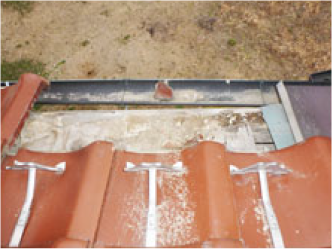 剥がれ落ちた漆喰の内部から、土が露出している状態です。酷くなれば、棟を支えることも難しいでしょう。今後、さらに土が流出し、状況が悪くなる可能性が大きいです。