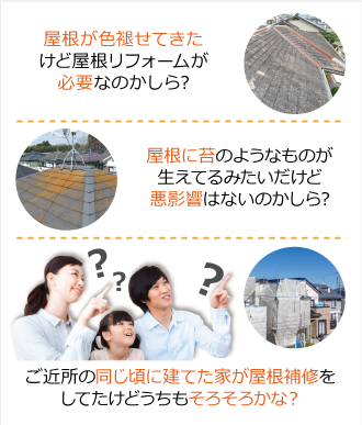 このページでは私たち街の屋根やさんが行う無料点検に関してご説明させて頂きました。点検時に費用が発生したり、点検時に工事を急かされ無理矢理契約をさせられた等、リフォームに関するトラブルを耳にしますが、私たち街の屋根やさんでは 10 のお約束を徹底し、常にお客様とお住まいにとって最適なリフォームをご提案させて頂いております。「飛び込み業者に屋根を指摘された」「正しい施工方法に関して知りたい」等、屋根工事・リフォームに関して気になる点・不安はお気軽にお問合せ下さい。