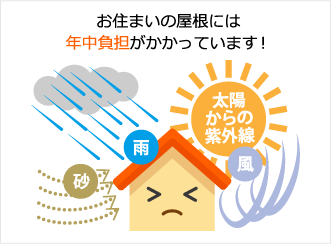 屋根は日々、私たちの生活を守る大切な役割を果たしていますが…風雨にさらされ、砂埃に晒され、紫外線に曝され、雨に打たれ、夏は高温、冬は低温… 実は屋根は日々相当なストレスを受けていることを忘れてはいけません。