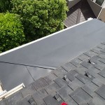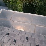問題のトップライトは奥側の屋根についているとの事で、屋根にのぼらせていただいて点検をさせて頂きました。外観上の破損は見受けられません。屋根の棟側からの雨仕舞もシッカリと水切りが入っており浸水する要素は一見、見受けられません。