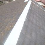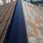 屋根復旧工事にあたり、剥がれてしまったコロニアルを戻すだけでは雨漏りが起きてしまいますので、剥がれてしまったコロニアルの横並びの列まで残っているコロニアルを撤去し、防水紙を新しく設置、新しいコロニアルを設置する屋根葺き替え工事が必要です。屋根葺き替え工事を行うことで、外れてしまった棟板金も合わせて工事を行います!