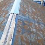 屋根の状況を確認させていただいたところ、雨漏り箇所の上部にあたる板金の経年劣化によって屋根内部に雨漏りが浸水し、雨漏りの原因となっていました。(>_<) 板金以外に雨樋からの雨水の配水が板金に直接流れるようになっているため、雨樋の配水を位置を変える必要があります!