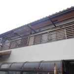 お客様のお家は寄棟で隅棟(下り棟)と呼ばれる屋根の四隅に付いている板金の一部が落下していました。この部分の隅棟の全てが落下してきたということは、風の影響が最も強い部分なのでしょう。お庭の片隅に落下してきた棟板金が置かれていました。