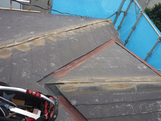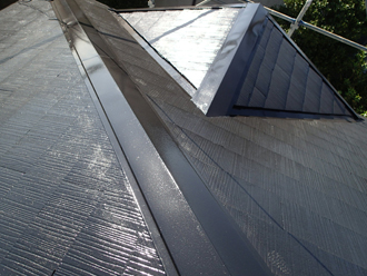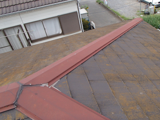 訪問業者より、棟板金の浮きを指摘されご不安になられたお客様よりご依頼を承りました。屋根全体が色褪せていた為、塗装が必要とされる時期に来ていましたが将来的に長く住むつもりはないとお伺いした為、棟板金の交換工事のみとなりました。複雑な形状となっているつなぎ目もシーリングの充填によってしっかりと止水処理をしました。