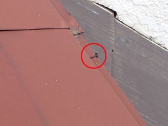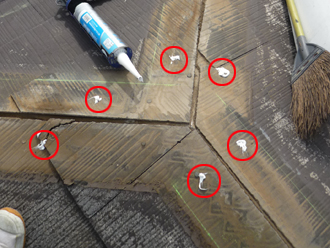 築10年程度経過した屋根を点検させて頂きますと、ほとんどのケースで棟板金を固定する釘が抜けかけてしまっています。しっかりと打ち込んでいたとしても気温差による金属収縮や下地である貫板(ぬきいた)の劣化進行により釘の緩みを避ける事は出来ません。経年により棟板金の固定力の低下は必ず起こります。
