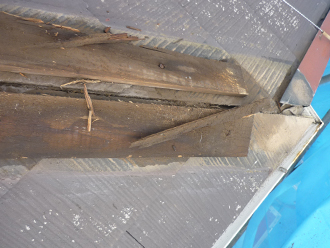 リフォーム工事により2階天井の解体を進めていたところ、屋根下地合板(野地板)に雨染みを発見し、調査をしたところ隅棟からの雨漏りでした。原因は、貫板と屋根面の隙間を塞いでいたシーリングと推測されました。隙間を塞ぎすぎてしまいますと、水分の逃げ道が無くなってしまいます。雨水により腐食が進行していた軒板を撤去し、新規に樹脂製のタフモックを使用して棟板金を設置させて頂きました。