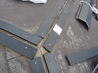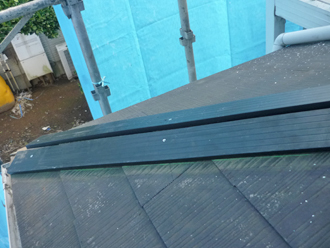 棟に瓦が使用されているタイプの屋根でしたが、台風により倒壊してしまった為、新規の棟板金工事を施工させて頂きました。樹脂製の貫板を使用させて頂いた為、丈夫です。