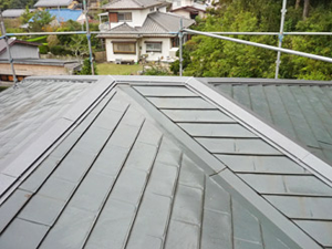 訪問業者より、棟板金の浮きを指摘されご不安になられたお客様よりご依頼を承りました。屋根全体が色褪せていた為、塗装が必要とされる時期に来ていましたが将来的に長く住むつもりはないとお伺いした為、棟板金の交換工事のみとなりました。複雑な形状となっているつなぎ目もシーリングの充填によってしっかりと止水処理をしました。