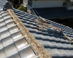 棟瓦取直し工事は棟瓦(屋根の頂上部分の瓦)を一旦取りはずし、再度漆喰を詰め直して、取りはずした棟瓦を再び設置していきます。瓦がズレたり、漆喰が剥がれてほとんどなくなってしまっていたりと重症な場合に行われます。