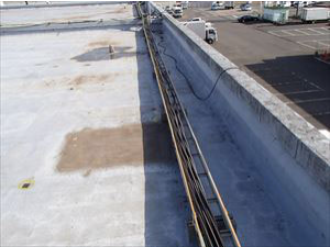 シートを用いた防水で見られる病状です。一見、浮きや波打ちがなくても、踏むと変形する場合はトップコートやその下の防水シートが弱ってきています。