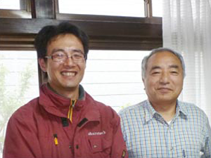 | 先程、取りはずした棟瓦を再度、積み直していきます。曲がらないよう、糸に沿って慎重に積み上げていきます。 平地とは違い、勾配がある中で、ものを真っ直ぐ積んでいくのはなかなか大変なことです。職人の腕の見せどころです。 |