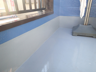 防水層を作り、トップコートで仕上げます。下地が剝き出しになりひび割れしていたベランダでしたが、すっかり綺麗になりました。防水性能も戻り雨漏りも解消です!