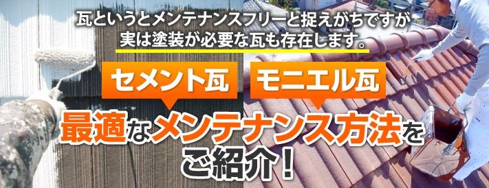 ●粘土瓦と違い、セメント瓦とモニエル瓦は塗り替えのメンテナンスが必要です。●外観が非常に似ているセメント瓦とモニエル瓦ですが、小口 ( 瓦の上端や下端 ) で見分けることが可能です。小口がすっきりしていればセメント瓦、ゴツゴツしていればモニエル瓦です。