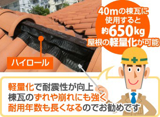 現在では漆喰を除去してハイロールを使った棟瓦取り直しが一般的になりつつあります。 漆喰に較べるとハイロールはかなり軽量で、40mの棟瓦に使用すると約650kg屋根の軽量化が可能です。 耐震性が向上へ大きく寄与するだけでなく、棟瓦のずれや崩れに対しても強くなり、耐用年数も長くなるのでお勧めです。