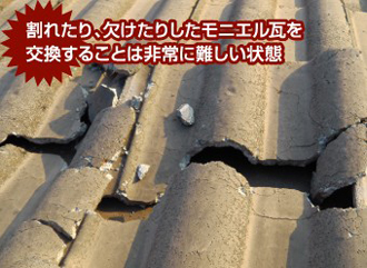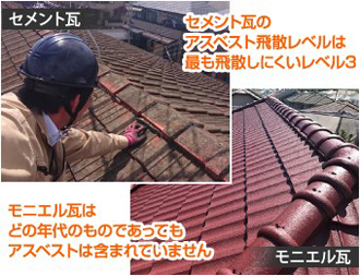 2004年以前製造のセメント瓦はアスベストを含み、モニエル瓦は一切使用されていません。