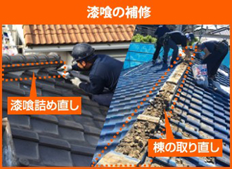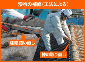 セメント瓦屋根やモニエル瓦屋根にも漆喰が使われており、それが剥がれてきた場合には漆喰詰め直しを行わなければなりません。