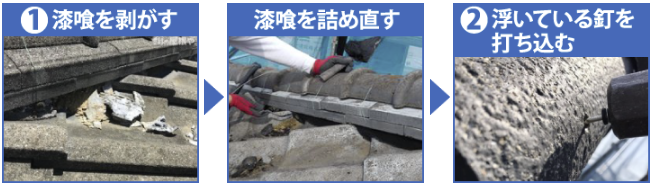 2.セメント瓦屋根やモニエル瓦屋根は漆喰の他、釘も併用して固定されています。釘が浮いている場合は打ち込みます。