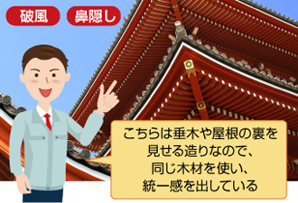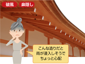 また、神社や仏閣の場合、垂木が見える構造ですが敢えて美しく見せるためです。一般的な住宅では、そういった配慮がないため、破風や鼻隠しで隠さなければ、雑然としてしまうでしょう。
