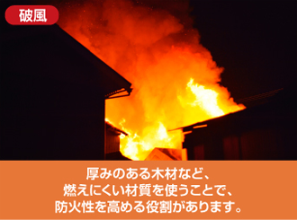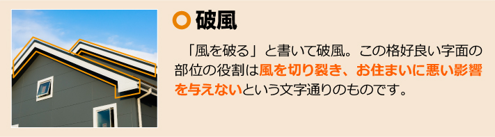 「風を破る」という文字の「破風」。名前の通り、破風は風を切り裂く役割があります。破風は風を裂き、屋根が飛ぶことを防いでくれます。屋根を守ってくれる破風は、住まいにとって大切な部分なのです。