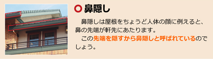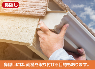 鼻隠しは、雨樋を取り付ける場所になっています。雨樋を「鼻隠し」と「垂木」の両方に取り付けすることで、強く固定できるからです。