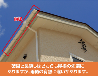 「破風」と「鼻隠し」は、屋根の端にある部分です。そのため、混同されてしまうこともあります。見分け方のひとつが「雨樋が付いているか・いないか」です。鼻隠しの上には雨樋が設置されていますが、破風にはありません。