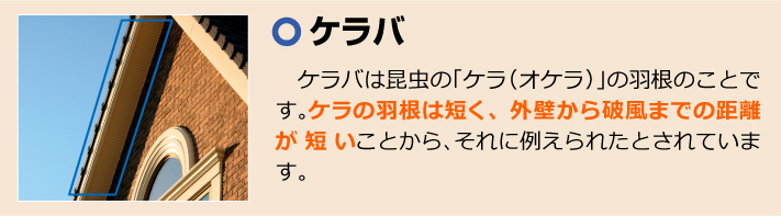 ケラバは、屋根全体で見るととても短い部分です。ケラ(オケラ)という昆虫の短い羽根がイメージされ、「ケラの羽根みたいな場所」が名前の由来なのだとか。外壁の劣化や雨漏りを防ぐ役割も担っている重要な場所です。