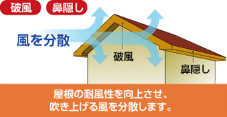 そのため、屋根の先端に破風板や鼻隠しなどを取り付ければ、下から吹き上げるような風を分散させられます。