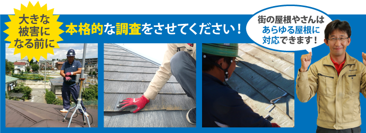 ここまででご自分でできる屋根やお住まいの点検について見てきましたが、詳細な点検は是非街の屋根やさんにご依頼いただきたいと思います。