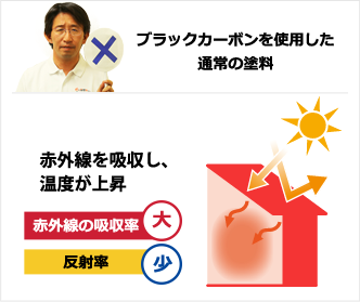 普通の塗料には黒色を出すためにカーボンブラックという顔料が使われています。このカーボンブラックが温度の上昇の原因で、赤外線を吸収するために温度が上昇してしまうのです。