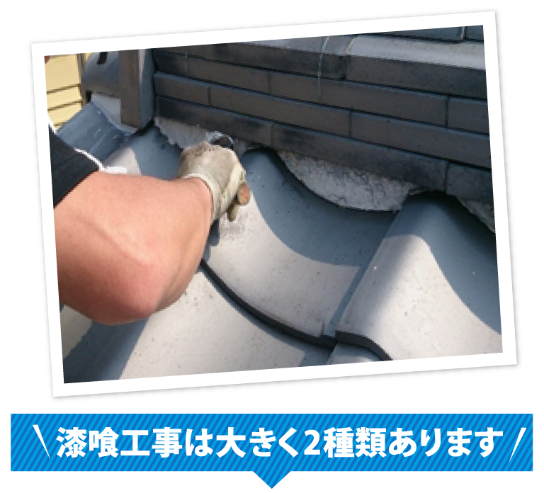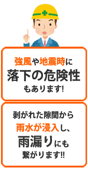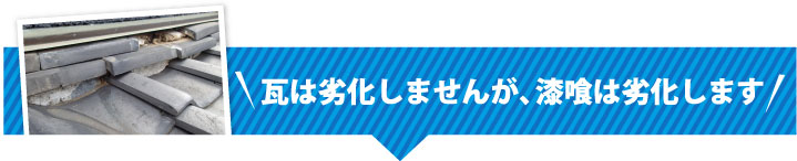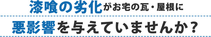 漆喰の歴史は古く、約5000年前から世界中で使われています。瓦や石材の接着、目地の充填、壁の上塗りなど漆喰は様々な場面に用いられてきました。日本が世界に誇る世界遺産「姫路城」、その白鷺と形容される美しい白壁にも漆喰が用いられています。 瓦屋根では瓦の固定や接着に漆喰が用いられています。この漆喰も風雨や寒暑、直射日光に晒され続けているので、他の屋根材と同じように時間とともに劣化していきます。目視して、ひびや剥がれが出ている場合は危険です。固定している力が弱まっているので、ちょっとした風や地震で瓦がズレたりします。最悪の場合は落下してしまう可能性もあります。また、ズレた瓦同士が干渉し合って欠けたり・割れたり、そこから雨水が浸入して雨漏りになったりと様々なトラブルを招きます。