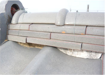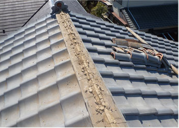 棟は本来まっすぐになっていなけれなりませんが、ご覧の様に曲がっているのがお分かりいただけるでしょう(左写真)。これは漆喰の大部分が剥がれているためです(右写真)。漆喰が剥がれると中の土が水分を吸って傷みます。それによって棟の固定力が弱り曲がってしまうのです。
