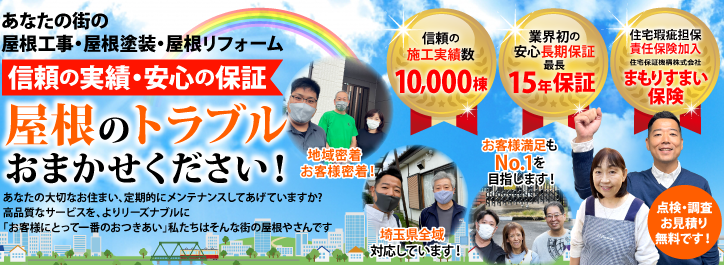さいたま市大宮区に拠点を置き、埼玉県全域で外装のリフォーム全般を行っております。埼玉県内から数多くのお客様にご依頼いただいている事を感謝しております。