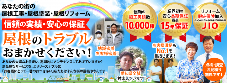 「街の屋根やさん」なら、お客様のご期待以上の結果をご提供する事が出来るのです。 また、工事後のアフターサービスにも力を入れてその後のご縁も大切にしています。 屋根・防水・外装の困りごとは、どんな事でも結構ですので「街の屋根やさん 名古屋南 店」にご連絡をください。いかなる時でも迅速・丁寧をモットーに対応させていただきま す。