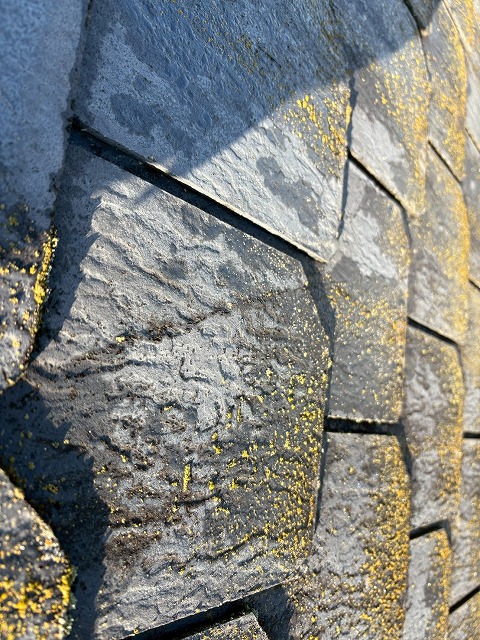 大東市で苔が発生した屋根の現地調査、黄ばんだ苔の放置は経年劣化が加速するので厳禁です