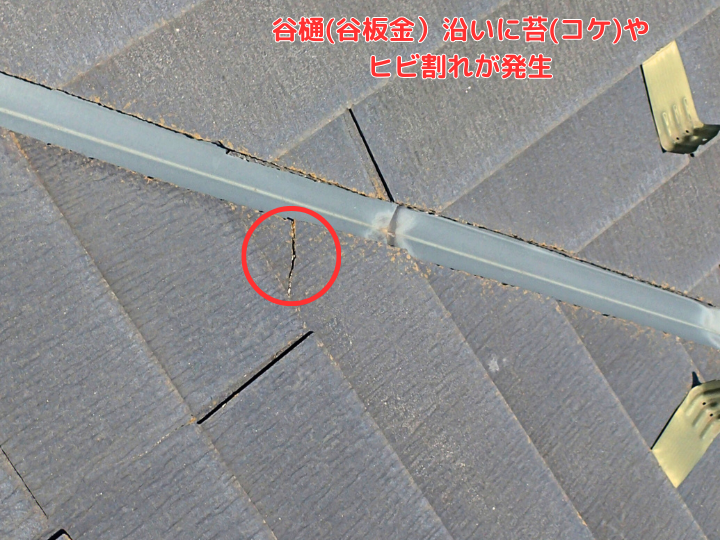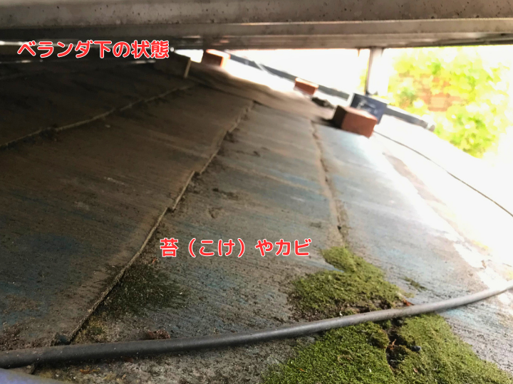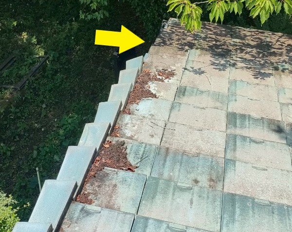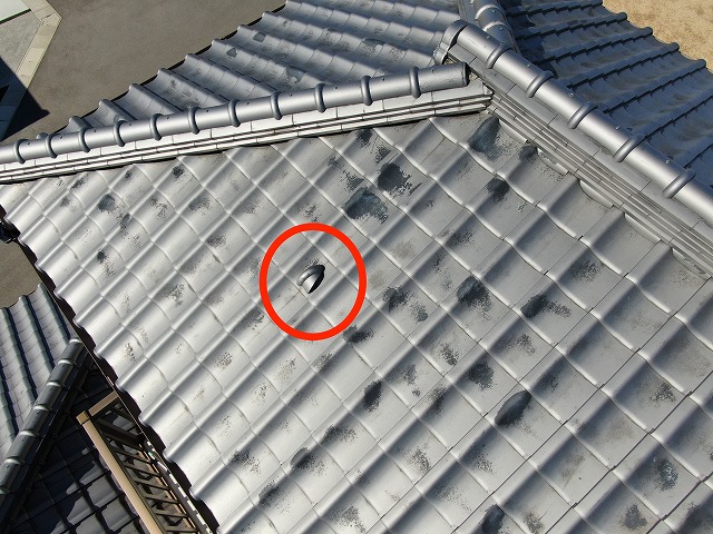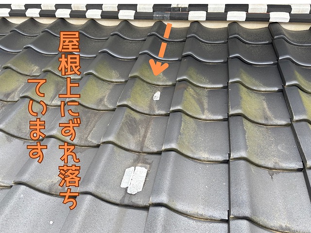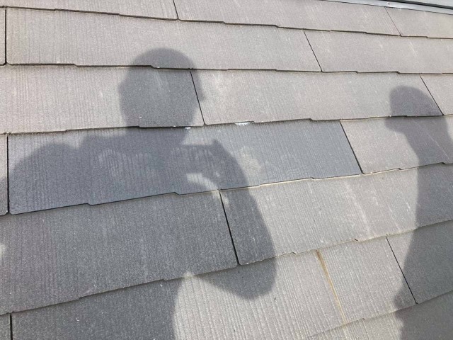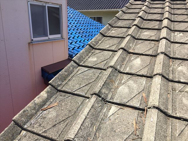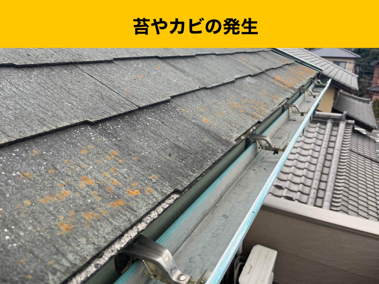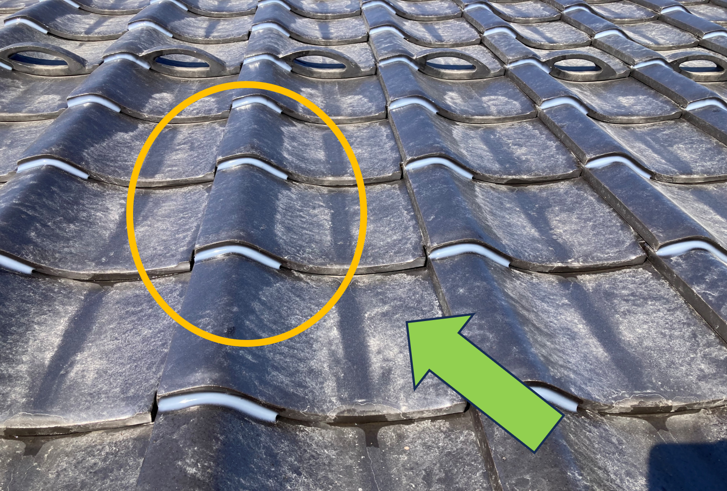 大東市で苔が発生した屋根の現地調査、黄ばんだ苔の放置は経年劣化が加速するので厳禁です