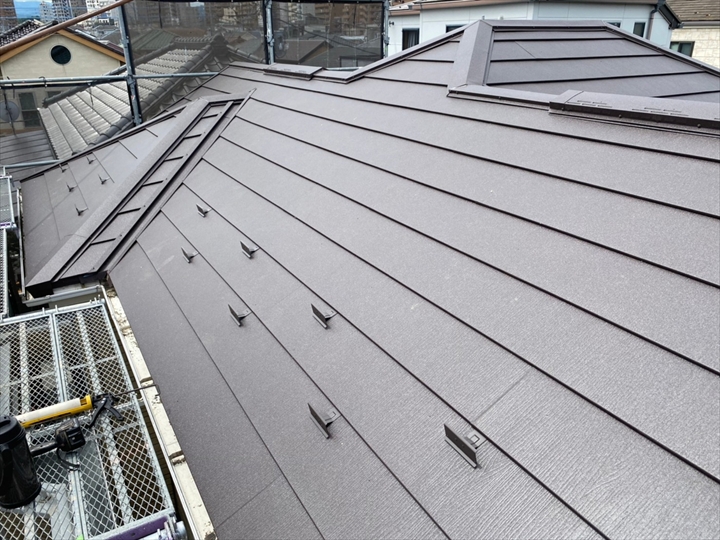 【堺市北区】屋根から原因不明の音鳴り|片棟板金のビス間隔が広く風の影響を受けていました