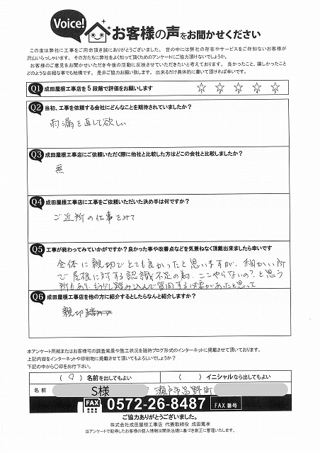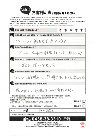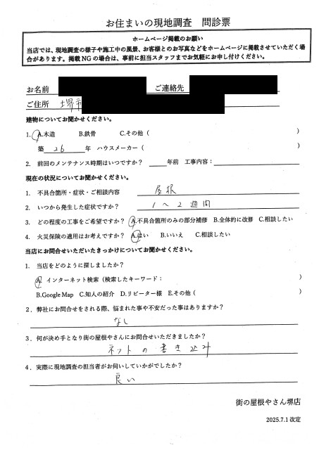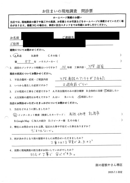小野町で雨漏り修理をご依頼の加藤様より、現地調査時のご感想を頂きました!