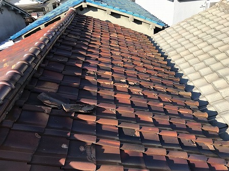 寝屋川市で塩焼き瓦の屋根点検!凍て割れでの表面の剥がれやズレ、漆喰劣化に注意