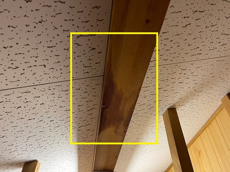 福岡市南区|雨漏りで天井クロスの剥がれ、原因は金属屋根のドレン詰まりとコーキング劣化