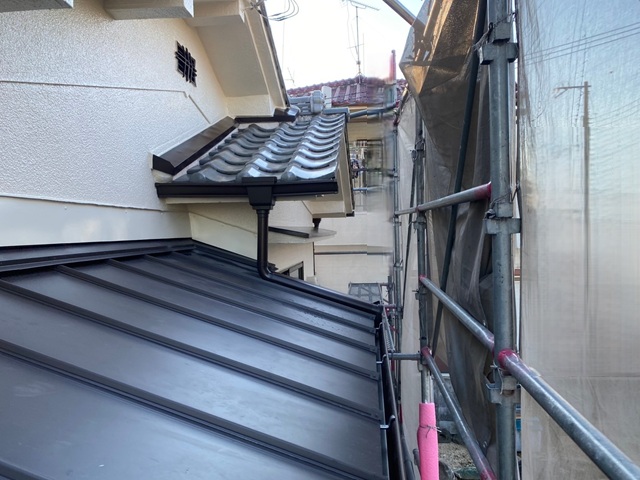 明石市 M様邸 雹被害により雨樋が破損。以前工事をしたお客様よりご依頼頂き、雨樋工事と追加で外壁塗装、立平葺き等の外装工事の施工をさせて頂きました。