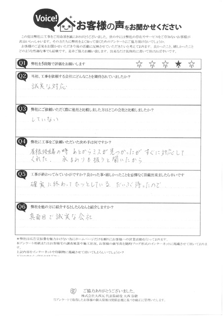 雨漏りが発生したため、原因を調べてもらおうと調査をお願いしました。連絡してからの対応も早く、現地調査では雨漏りしている箇所を的確に特定していただき、その状況や原因についても分かりやすく説明してもらえたので、とても安心できました。また、営業担当の方も職人さんもとても丁寧な対応で、こちらの質問や不安にもきちんと向き合ってくださり、信頼してお任せすることができました。迅速で丁寧な対応に、感謝しています。
