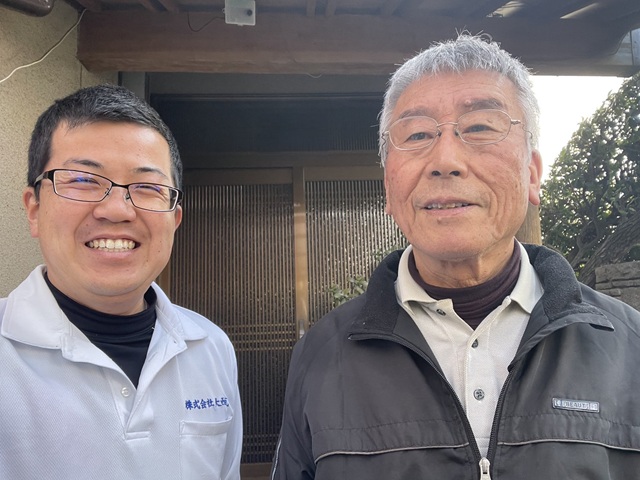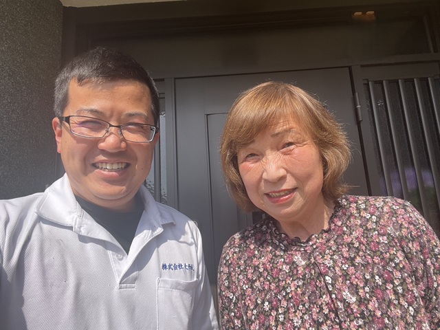 忠岡町で軒樋と竪樋の清掃と波板のフックの取替を行ったK様と工事完了後に記念写真を撮らせていただきました。K様ご協力いただきまして誠に有難うございます。K様より「雨樋を綺麗に掃除してもらい安心しました。」との嬉しいお言葉をいただきました。☆忠岡町のK様邸の軒樋と竪樋の清掃と波板のフックの取替のブログは只今、作成中です。暫くお待ち下さい。