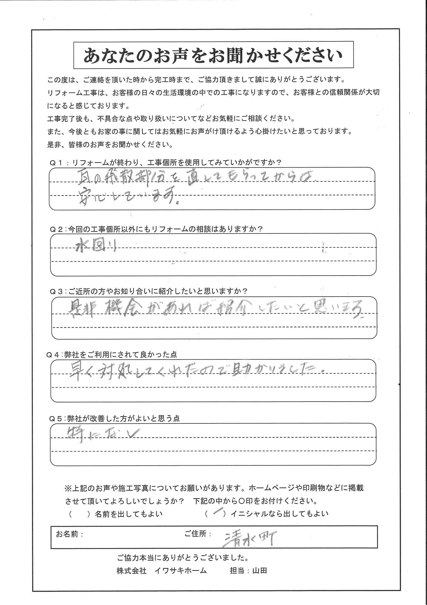 瓦の飛散部分を直してもらってからは安心しています。早く対処してくれたので助かりました。