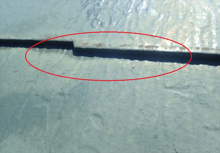 屋根の状況を確認させていただいたところ、雨漏り箇所の上部にあたる板金の経年劣化によって屋根内部に雨漏りが浸水し、雨漏りの原因となっていました。(>_<) 板金以外に雨樋からの雨水の配水が板金に直接流れるようになっているため、雨樋の配水を位置を変える必要があります!