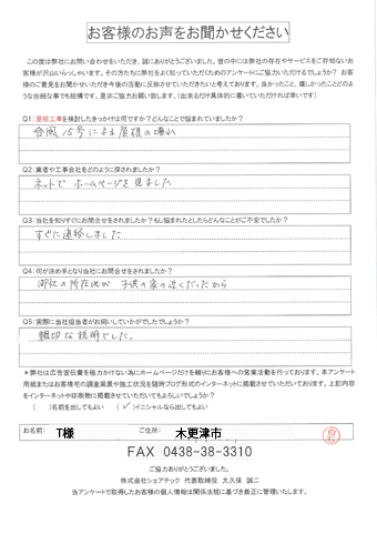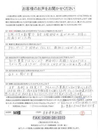 金額がかかる工事なので、一週間程、考えましたが、(台風被害部分だけの修理か全体を修理か?)信頼できる会社と考え、お願いする事にしました。