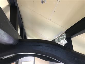 当初は蔵の天井でしたので、仕上がりは化粧野地板でした。二重の屋根構造になっていて、野地板の上には火災から財産を守る為に土が載せてあります。築100年経つ蔵の天井ですので古くなった箇所から土が部屋の中に落ちてくるため、今回は木工事で新たに天井を作りました。お部屋までの天井の層は3層となりました、新たに設置した天井はクロスに変更するために、大工さんが天井石膏ボードを貼り、クロスの下地が完成しました。いよいよ仕上げ工事による最終工事です。