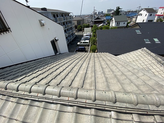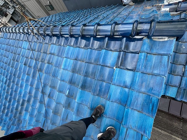 四条畷市 青い釉薬瓦を使った切妻形状屋根の雨漏り調査に伺いました。