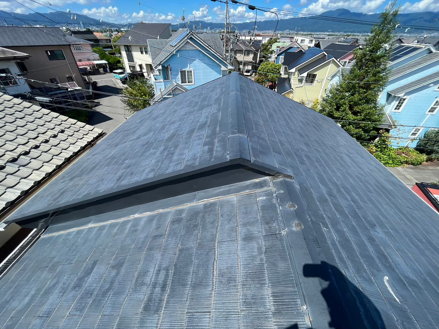 【栗東市】スレート屋根の日焼け、天井のシミでのご相談|屋根てっぺんの捲れが雨漏りの原因です!応急処置まで行いました。