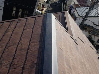 品川区中延で強風で飛散した棟板金を交換