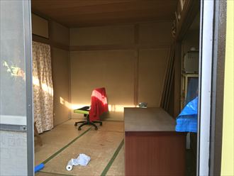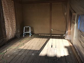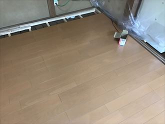 畳を外し、新たにフローリングが設置できるように段取りいたします。住みながらのリフォームですので、タンスなどはリビングの方へ移動しました。一日で畳の和室だった床をフローリングにします。できるだけ早く工事をして、お客様の生活のご負担を最小限にいたします。